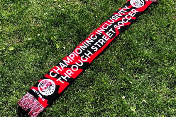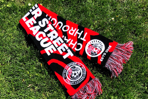 Support the Vancouver Street Soccer League and keep warm during those brisk fall and winter games or any time by sporting this knitted stadium scarf.